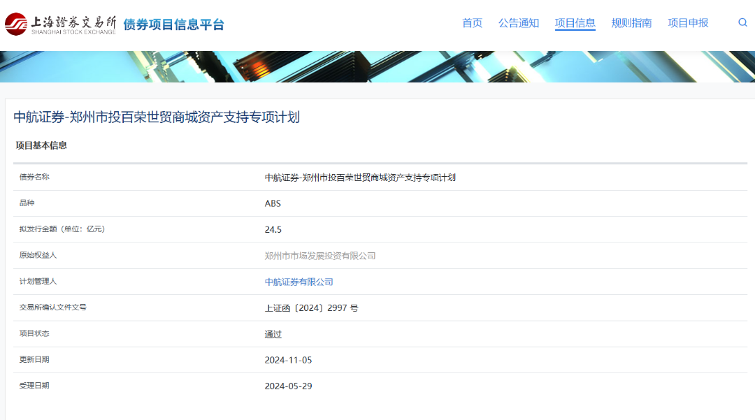 鄭州市投百榮世貿商城資產支持專項計劃獲上交所通過